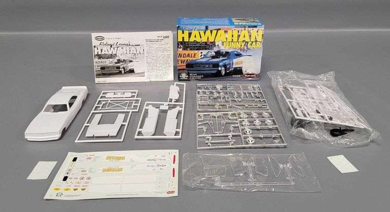 Polar Lights Roland Leong's Hawaiian Funny Car 1969 Model Kit, stock number 6502. This is an open box, sealed bag kit with all parts accounted for. This is perfectly sealed in an excellent original box