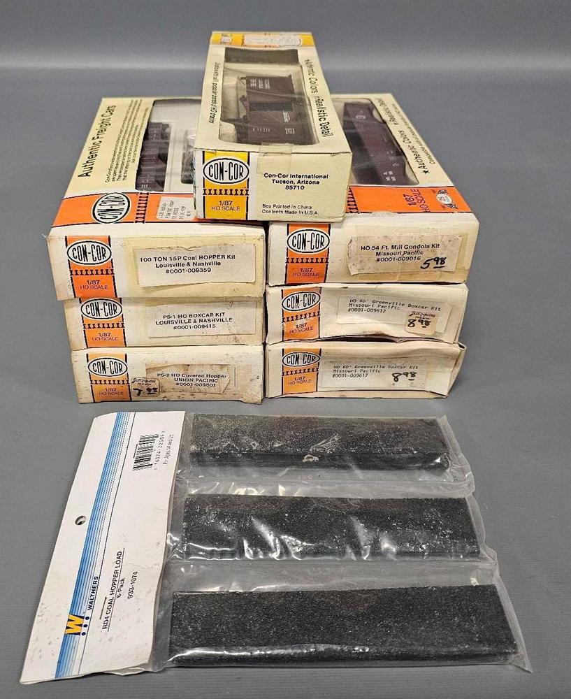 Seven Con-Cor freight car kits in original boxes plus Walthers RD4 coal hopper load 6 pack. Cars includes mill gondola, four box cars and two hoppers as seen in the photos.