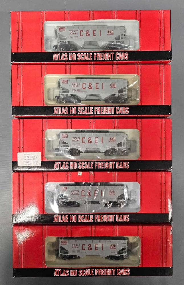 DescriptionFive Atlas HO Chicago and Eastern Illinois 2-bay offset side hopper cars in original boxes, stock numbers two 1868-2 and three 1868-3, the -2 cars have road number 97659 and the cars with -3 have road number 97788, C8-9 in very good original boxes as seen in the photos.