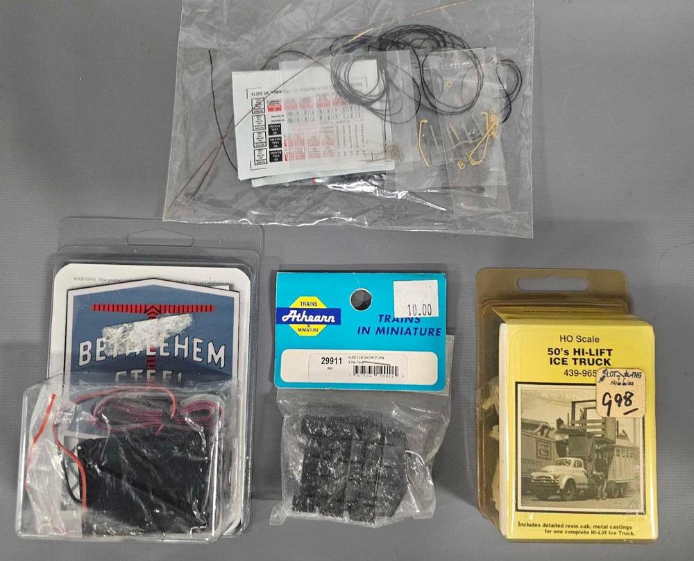 DescriptionSmall group of HO scale train detail parts to include Magnuson Models 439-965 50s Hi-Lift ice truck kit, Light Works USA 5281 Bethlehem Steel animated neon sign, Athearn 29911 hustler snow plow pilots 3-pack plus railings and decals that may be for a diesel locomotive.