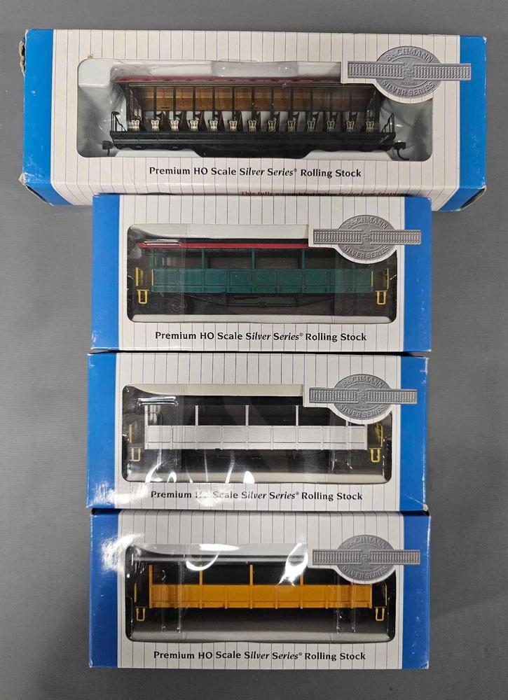 DescriptionFour Bachmann Silver Series HO excursion cars in original boxes to include stock numbers 17447, 17448 and 17449 which are all painted but unlettered plus 19346 Jackson Sharpe open side excursion car with seats, painted and unlettered, C9-10 in good to very good original boxes.