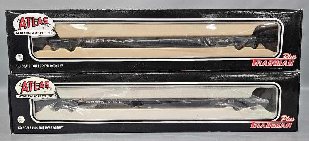Two Atlas Trainman Plus Allied Waste AWXX 85' trash container flat cars in original boxes to include road numbers20191 and 20195, both are C9-10 in good original boxes.