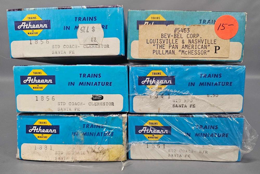 Six Walthers blue box HO scale Santa Fe passenger car kits with one Louisville and Nashville McHessor Pullman car, all unbuilt in fair to excellent original boxes as seen in the photos.