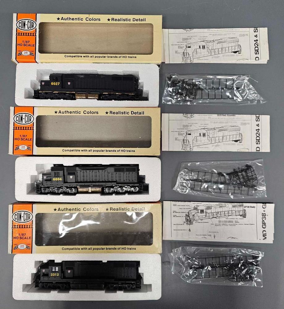 Three Con-Cor HO diesel locomotives in original boxes to include one GP-38 with cab number 2312 and two SD-35 with cab numbers 6004 and 6027, all are unrun with unassembled railings, C8-9 in very good original boxes as seen in the photos.