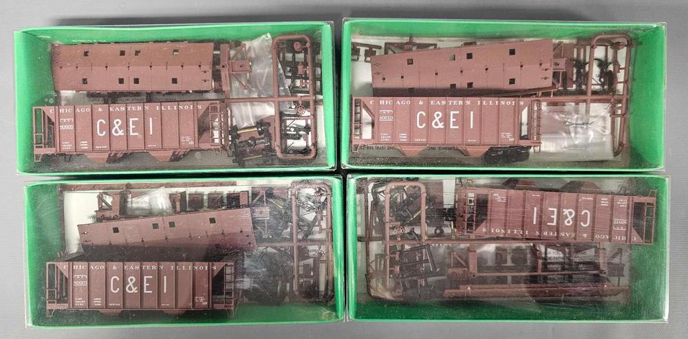 Four different Bowser HO Chicago and Eastern Illinois ACF 70 ton 2-bay covered hopper kits to include road numbers 80001, 80006, 80010 and 80017, all appear complete and unstarted in very good original boxes as seen in the photos.