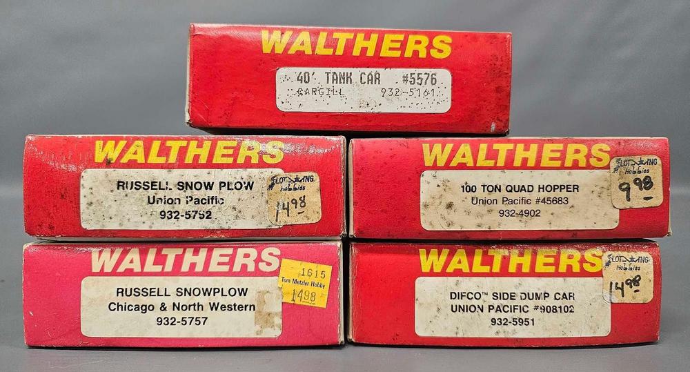 Five Walthers HO rolling stock kits in original boxes, some are built or partially built in fair to excellent original boxes as seen in the photos.