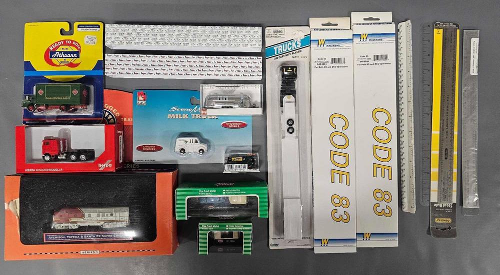 DescriptionMixed group of HO scale railroading items vehicles, track switches and measuring scales. Includes two lumber loads, two code 83 RH turnouts, one 6 and one 8, Eight different vehicles, some die cast some plastic and four different measuring devices as seen in the photos. Also includes a 1:120 Lionel A.T. & S.F. diesel locomotive