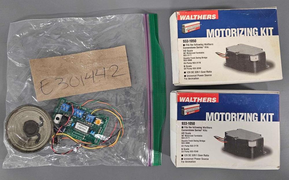 Walthers turntable motorizing kits plus HQ320-1 turntable circuit board and speaker. The two kits are new and untouched, stock number 933-1050. The circuit board and speaker are in nice shape, but are untested.