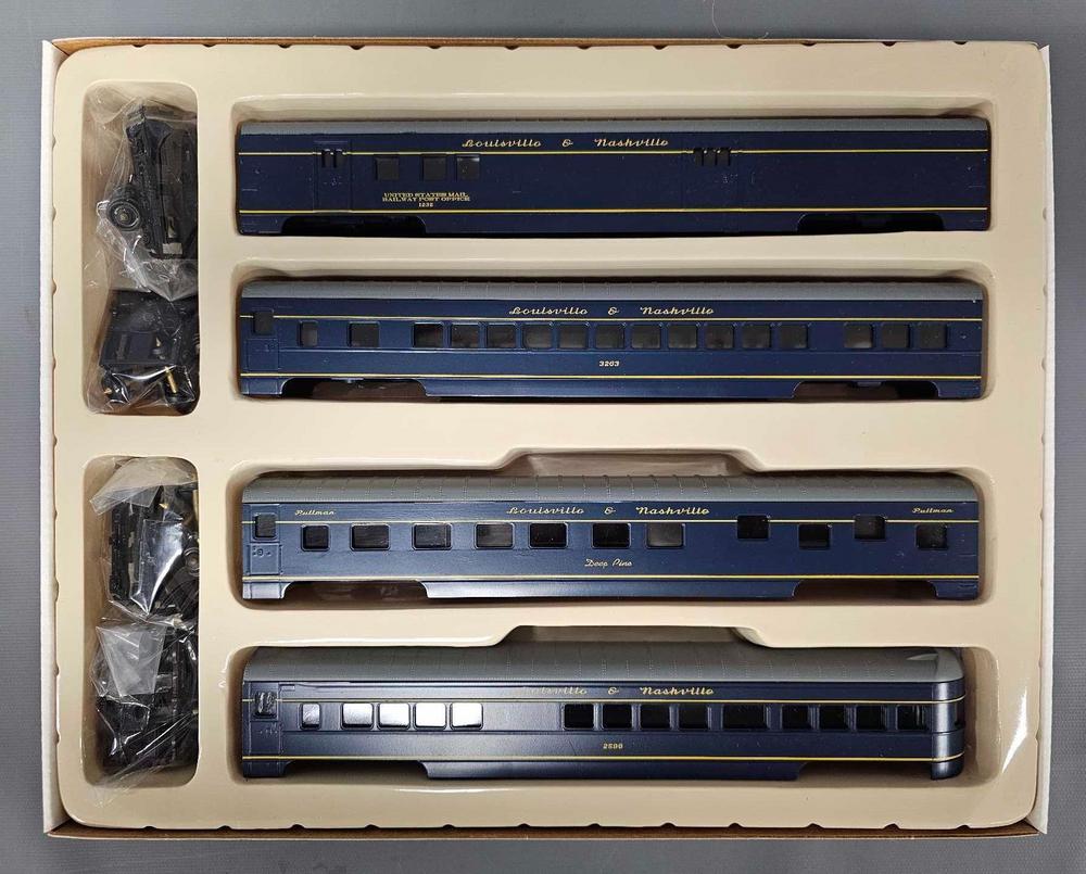 DescriptionCon Cor HO Louisville and Nashville 72 foot passenger car set in original box, stock number 92034. Set consists of 1235 RPO combine, 3263 coach, Deep Pine sleeper and 2596 observation car, C9-10 kit, the trucks must be assembled, comes in an excellent original box as seen in the photos.