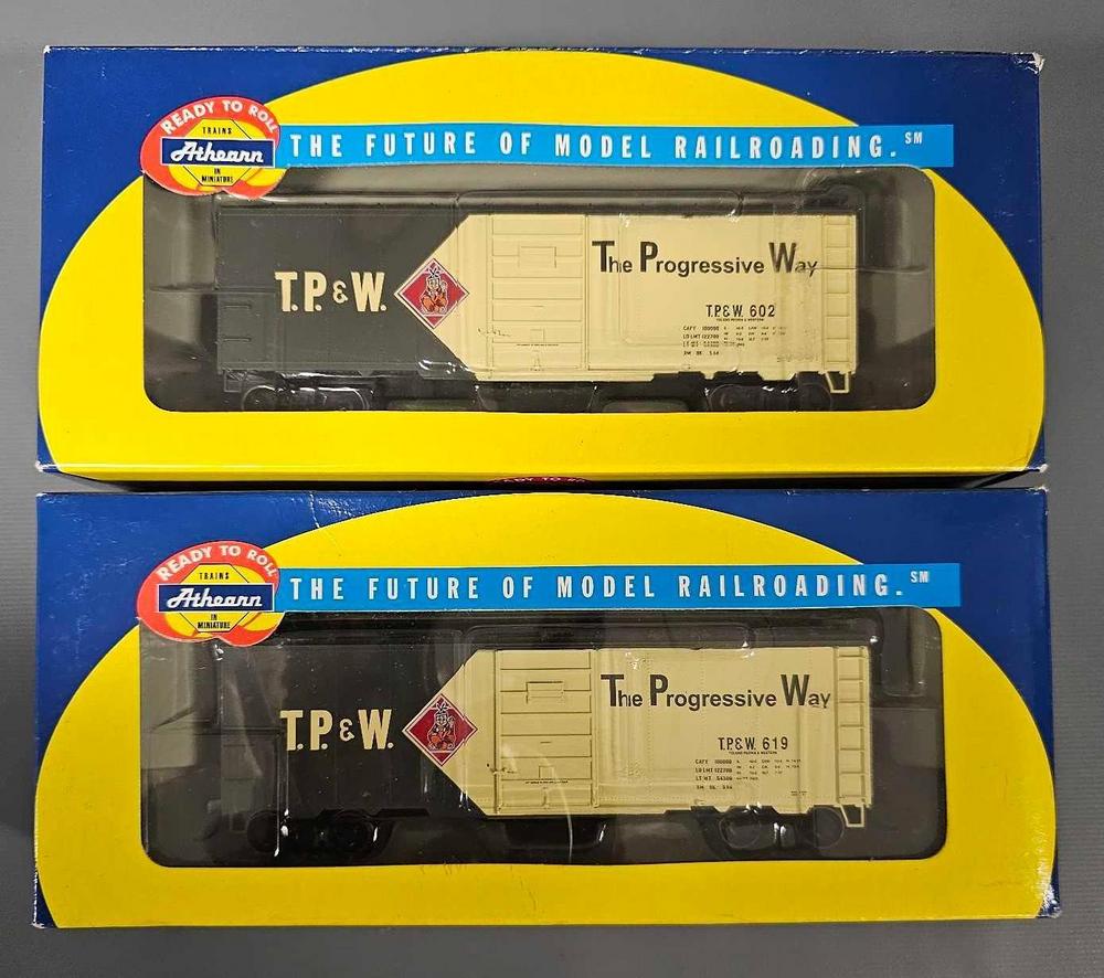 Two Athearn HO RTR Toledo Peoria and Western box cars in original boxes to include road numbers 602 and 619, C9-10 in excellent original boxes.
