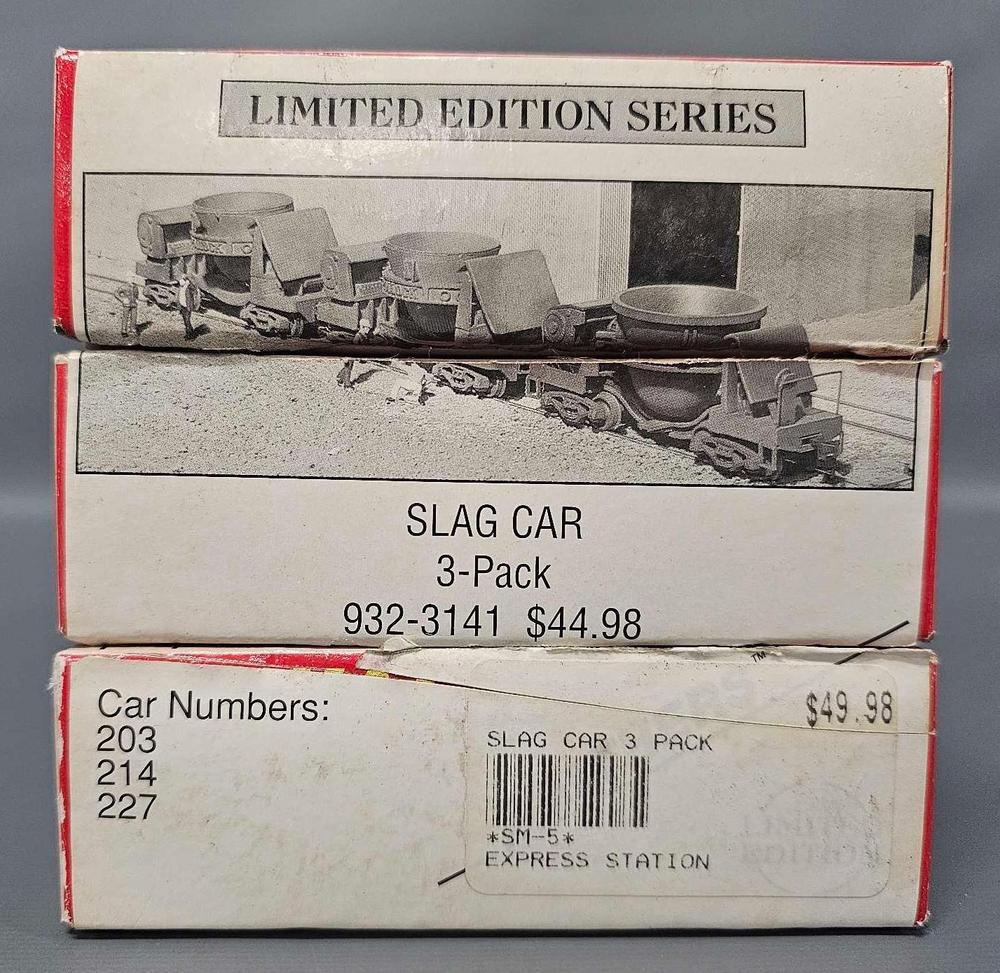 DescriptionWalthers HO Limited Edition slag car 3 pack, stock number 932-3141, road numbers 203, 214 and 227, the three boxes have been taken apart as they were cut horizontally on the ends but the kits are still shrink wrapped shut as seen in the photos.