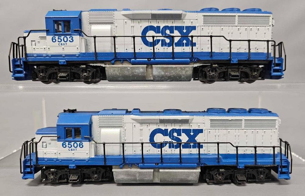Two Con-Cor HO CSX EMD GP-40 diesel locomotives in original boxes, road numbers 6503 and 6506. Both have been assembled but appear unrun and are C8 in good original boxes as seen in the photos.