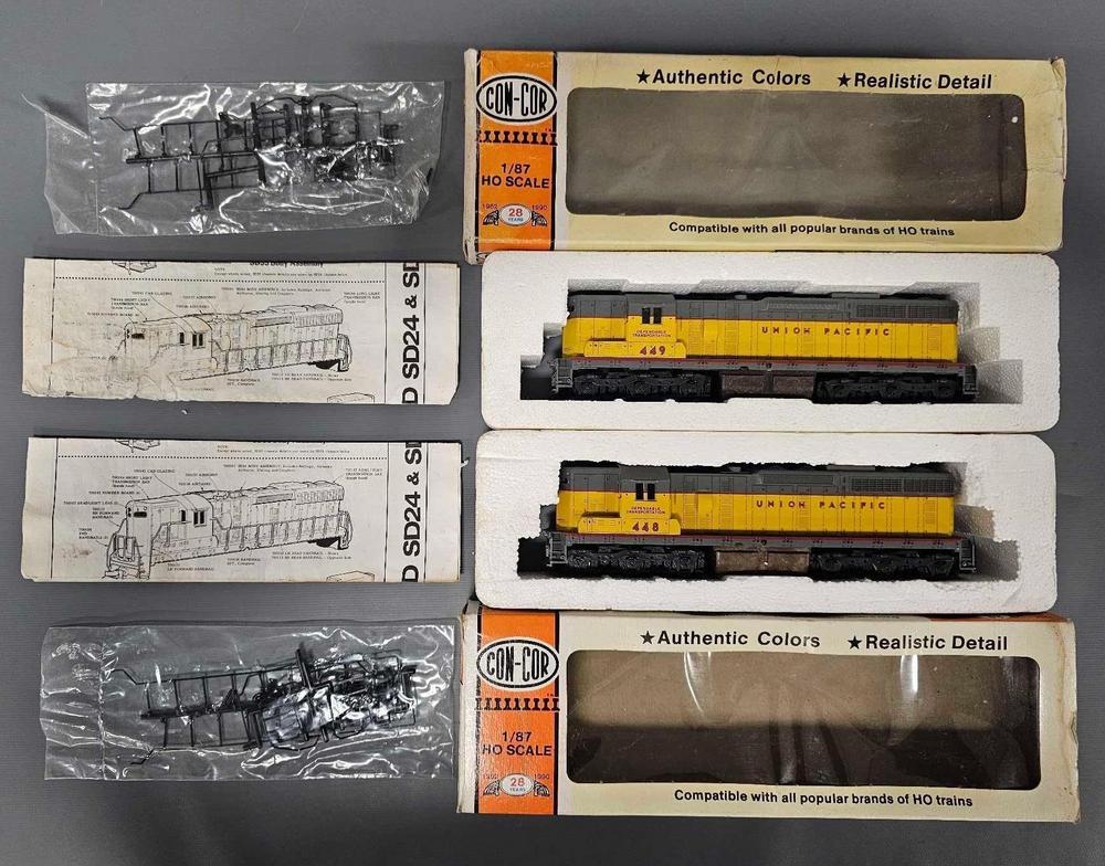 Two Con-Cor HO Union Pacific SD-24 diesel locomotives in original boxes, both are unrun with unassembled railings, C8-9 in very good original boxes as seen in the photos.