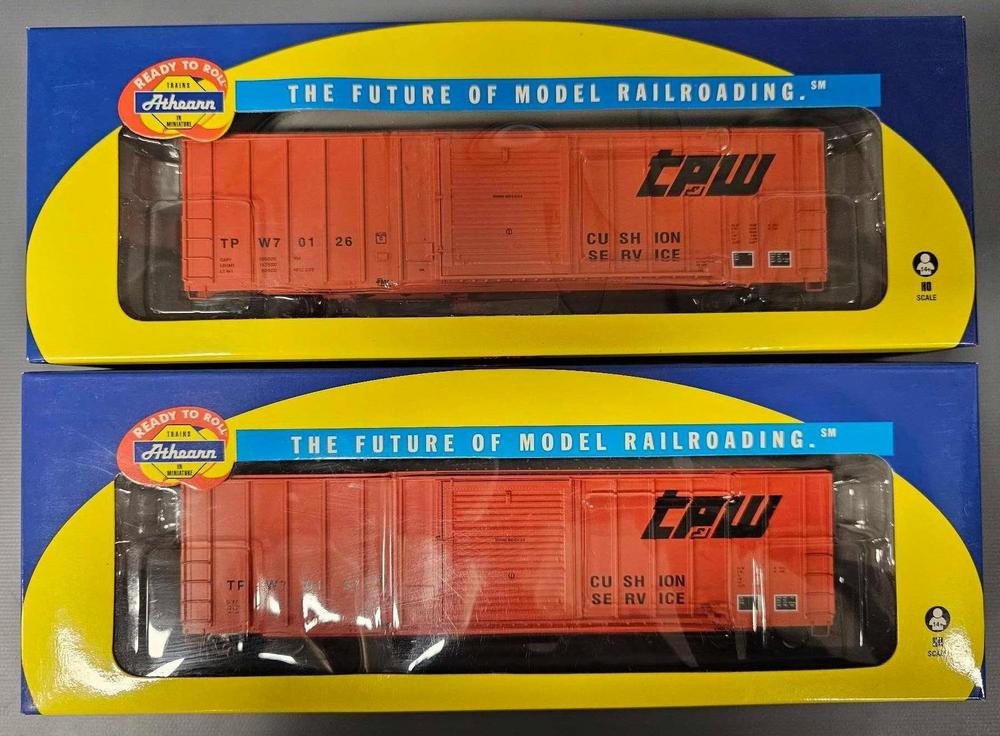 Two Athearn HO RTR Toledo Peoria and Western 50 foot FMC 5347 box cars in original boxes to include road numbers 70126 and 70137, C9-10 in excellent original boxes.