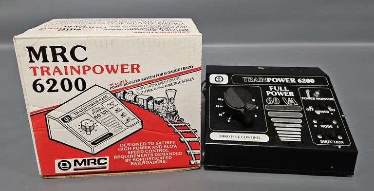 DescriptionMRC Trainpower 6200 Transformer in Original Box . This item comes with it's original box and features a throttle control, full power of 60VA, and a power monitor. This power pack is designed to satisfy high power and slow speed control requirements and is also engineered for use with HO, O, and G scales. It has not been tested recently but was used not long ago.