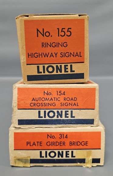 Three Postwar Lionel O Gauge Accessories in Original Boxes to include a 155 Ringing Highway Signal, 154 Automatic Road Crossing Signal and 314 Plate Girder Bridge, C6 in good original boxes.