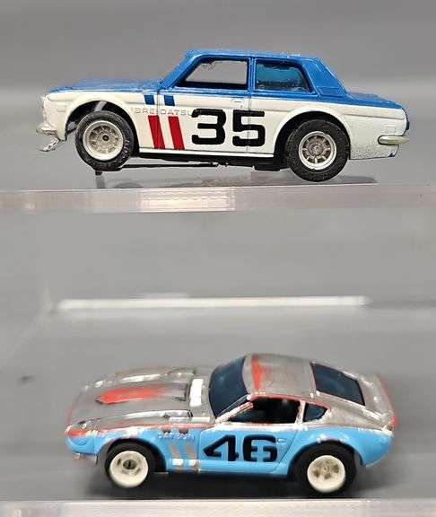 Two AFX Datsun HO Slot Cars to include a Datsun 510 BRE #35, the other a Datsun 240ZX #46 with blue sides and chrome top but has some paint missing. Both are on good running chassis.