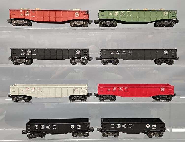 Eight Lionel Postwar O Gondolas to include two 2452 with five barrels each, one red and one gray 6562 with no canisters, black 6062 and three 6462, one black, one green and one brick red, C6+.