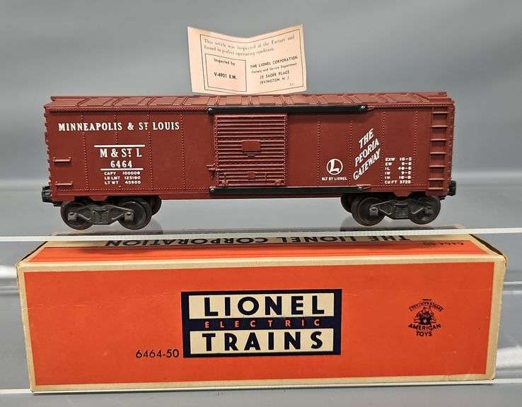 Lionel Postwar O 6464-50 Minneapolis & St. Louis Box Car in Original Box, C8 in a very good to excellent original box with original inspection slip.