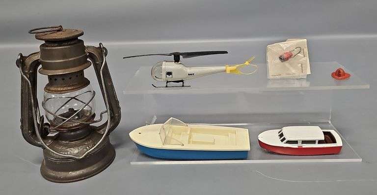 Vintage Lantern and Lionel Reproduction Loads. Includes a vintage metal lantern and two model boats, a toy helicopter, a tiny railroad lantern and a miniature fireman's helmet toy. Sold as-is as seen in the photos with no returns.