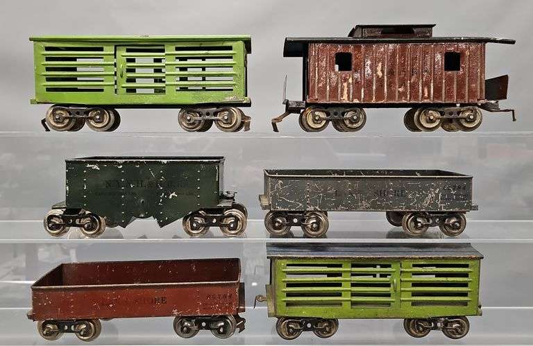 Six Early Prewar Standard Gauge Lionel Freight Cars to include two different 112 Lake Shore gondolas, two 113 stock cars (one with a repainted roof), dark green 116 N.Y.N.&H.R.R. hopper and a 117 NYC & HRRP caboose, C5-6.