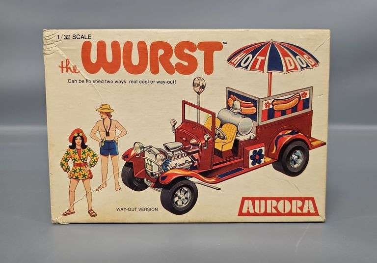 DescriptionAurora The Wurst Hot Dog Scene Machine 1/32 Scale Model Kit, stock number 596-150. This kit may or may not be complete as most of the parts are loose from the sprues and the engine block has been glued together. Comes with a nice original instruction sheet but no decals in a very good original box.