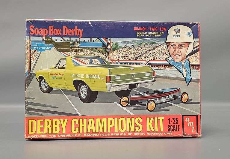 DescriptionAMT Derby Champions Chevelle El Camino & Soap Box Derby 1/25 Scale Model Kit, stock number T312-200. This kit appears to be complete with several parts loose from the sprues but the underside of the chassis / frame was painted black and stripped. A few parts have been glued but nothing major. Comes with two original instruction sheets and five decal sheets, two are mint unused originals, there is a mint reproduction and there are two damaged originals, all in a very good original box.