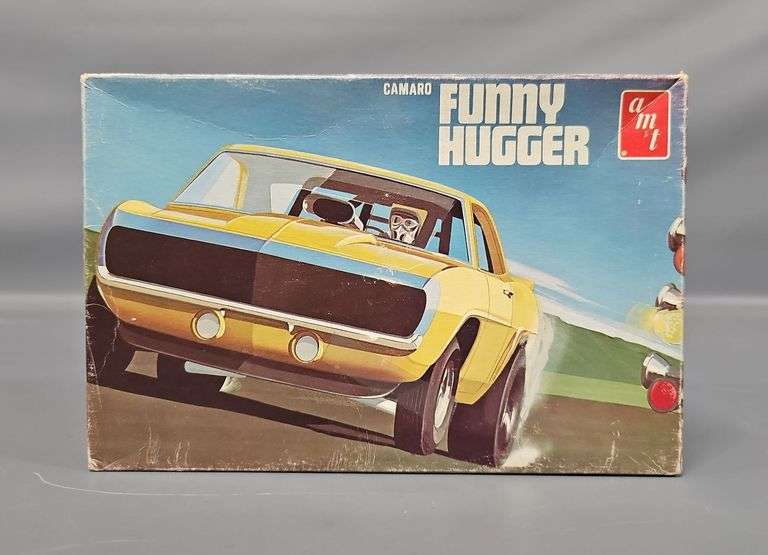 DescriptionAMT 1971 Camaro Funny Hugger 1/25 Scale Model Kit, stock number T344-225. This kit is incomplete as there is one chrome mag wheel missing, I am unsure if any other parts are missing but the white parts are still factory sealed and the blue molded parts are all there. Comes with a crisp original instruction sheet and mint unused decal sheet in a very good original box.