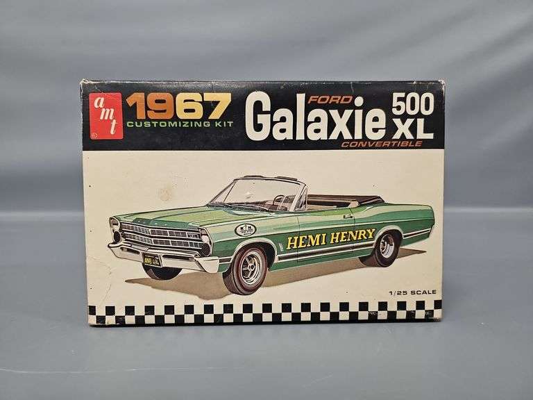 DescriptionAMT 1967 Ford Galaxie 500 XL Convertible Annual 1/25 Scale Model Kit, stock number 6117-200. This kit appears to be complete with a few parts loose from the sprues but no painting has happened. Two headlight lenses have been glued. The headliner is cracked in the very middle as seen in the photos. Comes with a browned and torn original instruction sheet and an unused decal sheet with three tire rings on it in a very good original box.