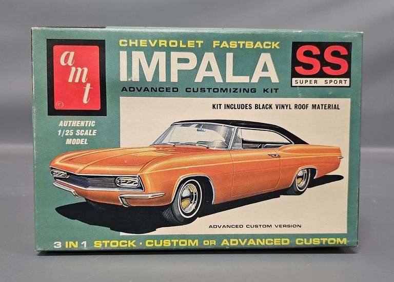 DescriptionAMT 1965 Chevrolet Impala Fastback SS Annual 3-in-1 1/25 Scale Model Kit, stock number 6725-200. This kit may or may not be complete with many parts loose from the sprues but no work has been started and no painting has happened. Comes with a crisp original instruction sheet and mint unused decal sheet in a very good original box.