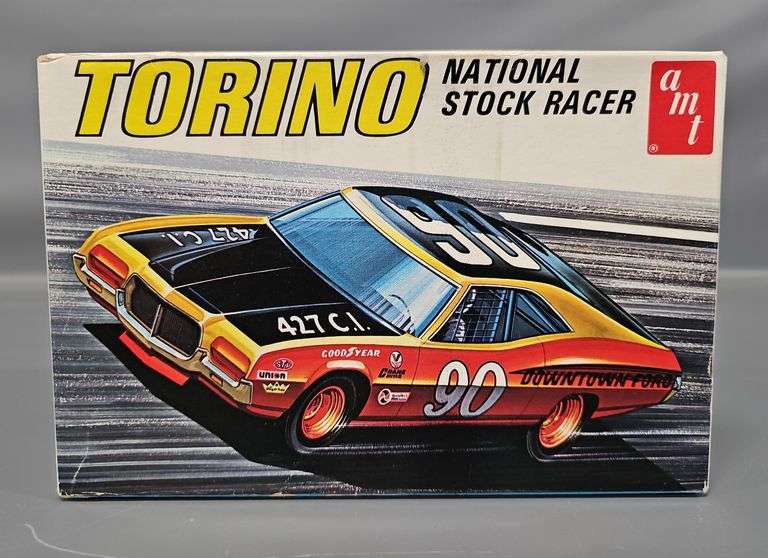 DescriptionAMT Torino National Stock Racer 1/25 Scale Model Kit, stock number T391. This kit appears to be complete with a few pieces loose from the sprues, good glass, crisp original instruction sheet and unused decals that are likely unusable in an excellent original box.