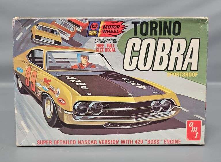 DescriptionAMT 1970 Torino Cobra Sportsroof 1/25 Scale Model Kit, stock number T321. Kit may or may not be complete as there are quite a few pieces loose from the sprues. Comes with a crisp original instruction sheet, mint unused decal sheet and Sports Wheels decal in an excellent original box. This kit can be built as Street, Strip or NASCAR.