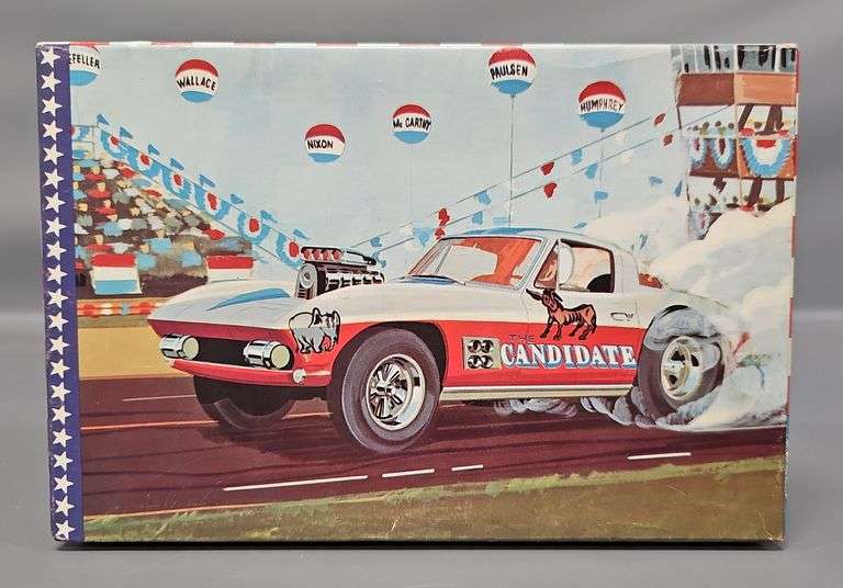 DescriptionAMT 1967 Corvette 'The Candidate' 1/25 Scale Model Kit, T201-200. Kit may or may not be complete as some parts are loose from the white sprues but apparently more spots on the sprues than parts to fill them. Chrome sprue appears complete with one loose part, glass is good and comes with a crisp original instruction sheet and mint unused decal sheet in an excellent original box.