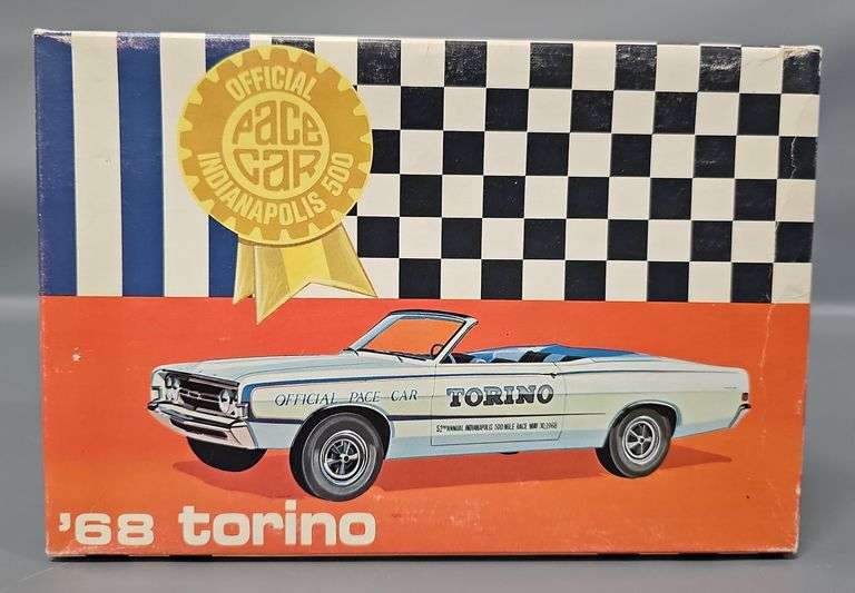DescriptionAMT '68 Torino Official Indianapolis 500 Pace Car 1/25 Scale Model Kit, stock number T237-200. This kit could be complete but most of the parts are loose from the sprues, there are still several chrome parts on the sprue. The body is great and the glass is clean, comes with an excellent original instruction sheet and mint unused decal sheet and unused Autolite sticker in an excellent original box.