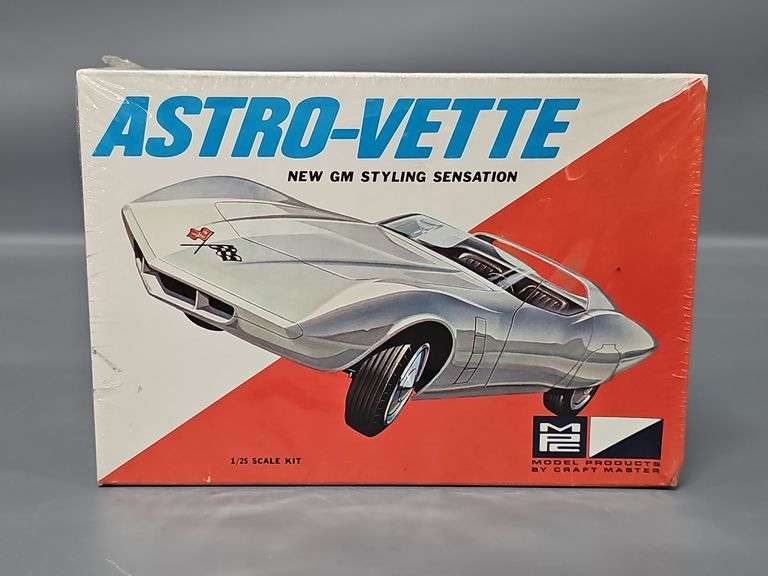 DescriptionFactory Sealed MPC Astro-Vette New GM Styling Sensation 1/25 Scale Model Kit, stock number 509-200. This is a high grade example of a scarce vintage original kit. There is a small area on one end that is missing, it appears that the original price sticker was cut off long ago. It is a super clean kit.
