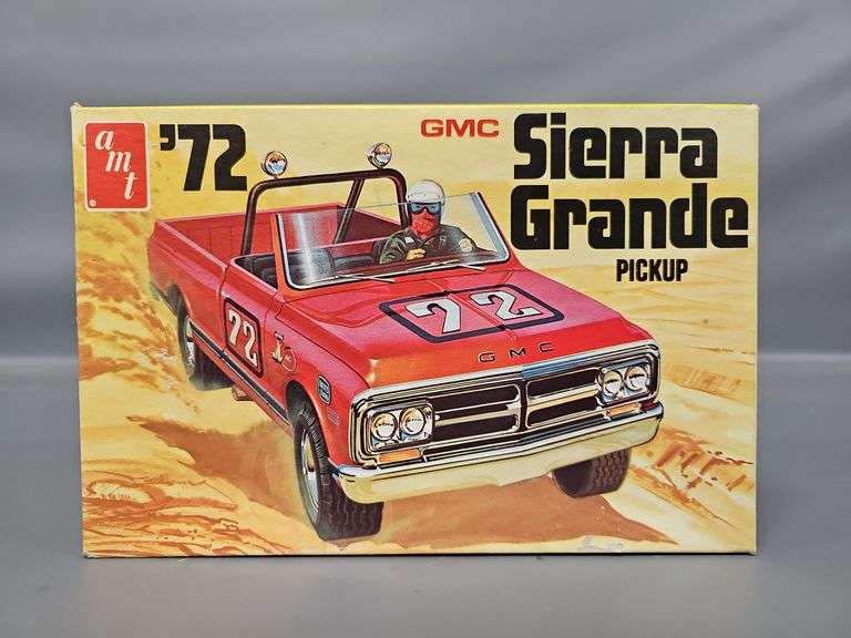 DescriptionAMT 1972 GMC Sierra Grande Pickup Truck 1/25 Scale Model Kit, stock number T364-225. This kit may or may not be complete but the majority of the parts are still attached to the sprues. There has then no work started and there are no damaged parts. Comes with a crisp original instruction sheet and a mint unused decal sheet in an excellent original box.