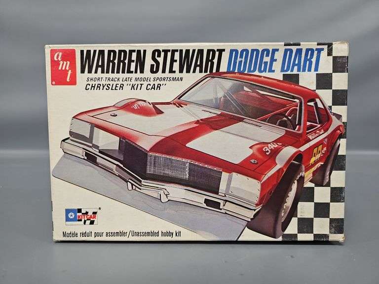 DescriptionMint Unbuilt AMT Warren Stewart Dodge Dart Chrysler 'Kit Car' 1/25 Scale Model Kit, stock number T231. This is an open box, sealed bag kit with all parts accounted for. Comes with a crisp original instruction sheet and mint unused decal sheet in a very good original box with exterior tape repairs.