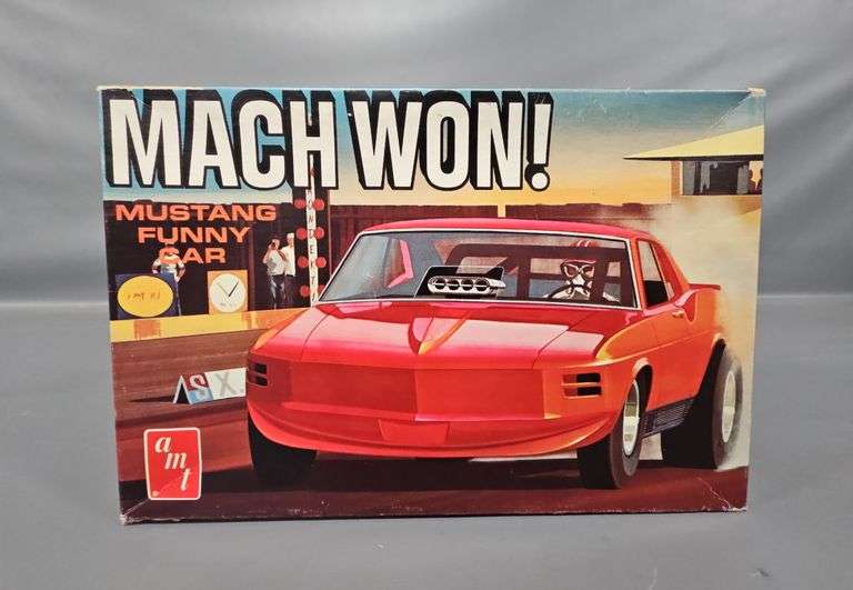 DescriptionMint unbuilt AMT Mach Won! Mustang Funny Car 1/25 Scale Model Kit, stock number T341. This is an open box, sealed bag kit with all parts accounted for and none damaged. Comes with a crisp original instruction sheet and mint unused decal sheet in an excellent original box.