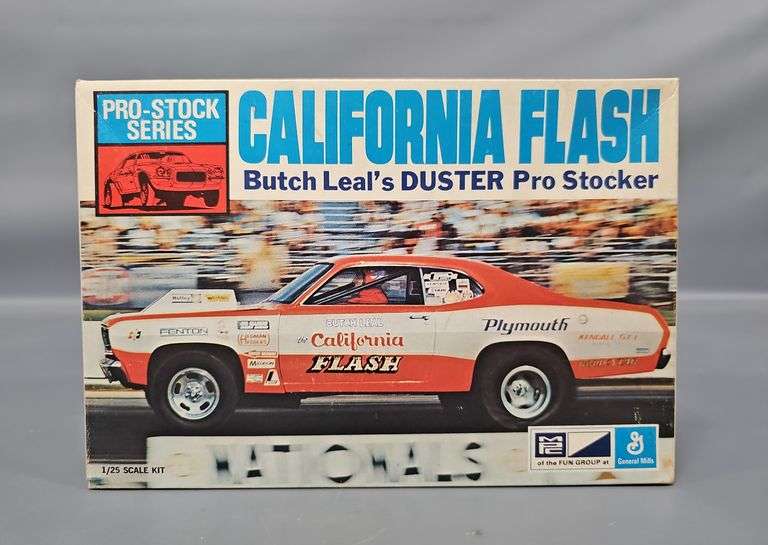 DescriptionMPC Butch Leal's California Flash Duster Pro Stocker 1/25 Scale Model Kit, stock number 1-1752-225. Kit may or may not be complete as there are many parts loose from the sprues with some painted and some assembled. Comes with a crisp original instruction sheet and mint unused decal sheet in an excellent original box.