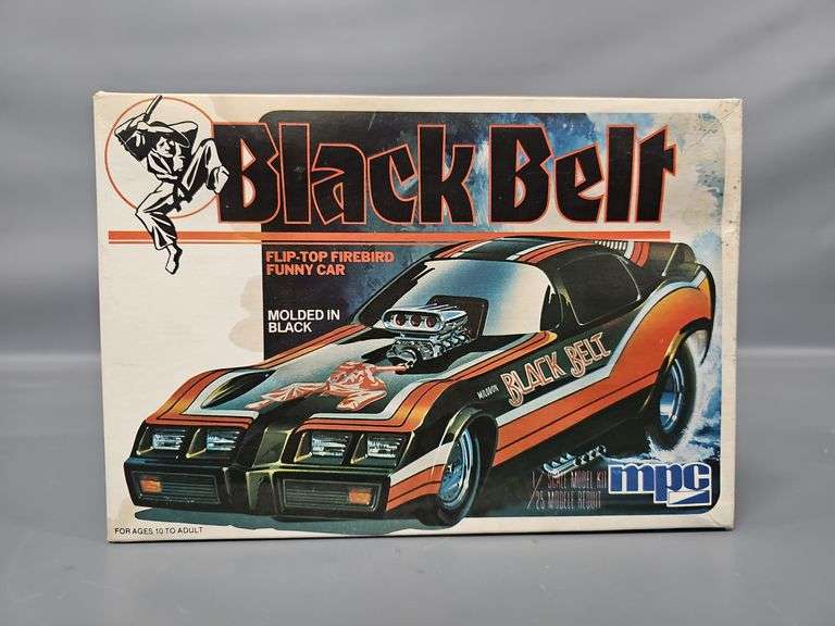 DescriptionMinty Unbuilt MPC Black Belt Flip-Top Firebird Funny Car 1/25 Scale Model Kit , stock number 1-0801. This is an open box, sealed bag kit with all parts accounted for but the windshield has tire burn melt marks. Comes with a crisp original instruction sheet and a water stained unused decal sheet in an good original box with water stains.