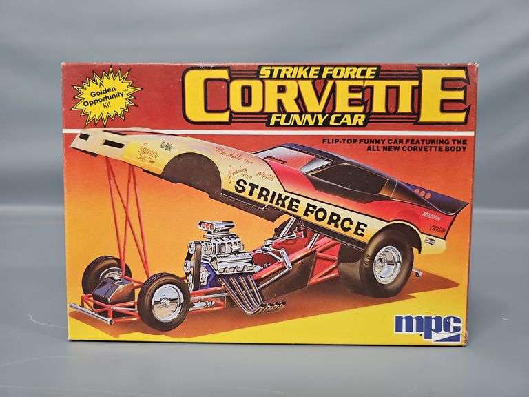 DescriptionMPC Strike Force Corvette Funny Car 1/25 Scale Model Kit, stock number 1-0737. Kit appears to be complete with all parts accounted for but the back window glass has a melt mark on it. Comes with a crisp lois and mint unused decal sheet inan excellent original box.