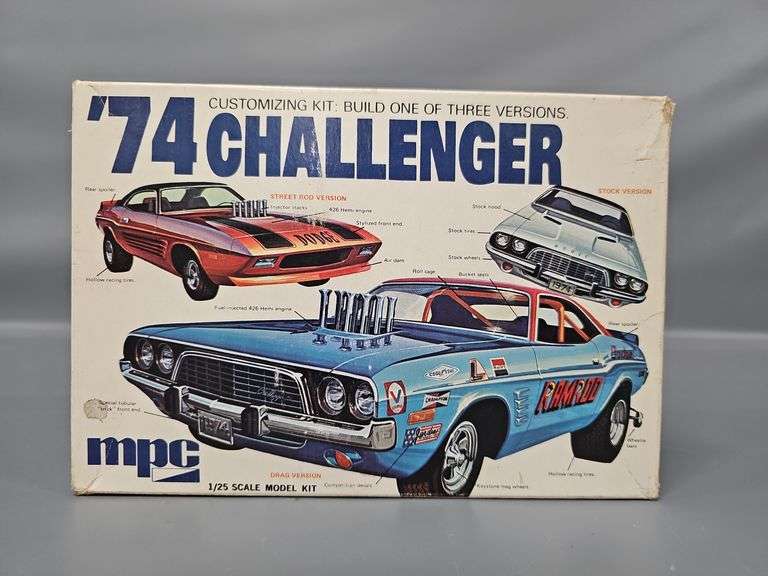 DescriptionMPC 1974 Dodge Challenger 1/25 Scale Model Kit, stock number 1-7414-225. This kit may or may not be complete as there are many loose parts from the sprues, no work started and no damaged parts. Comes with a crisp original instruction sheet and mint unused decal sheet in a very good to excellent original box.