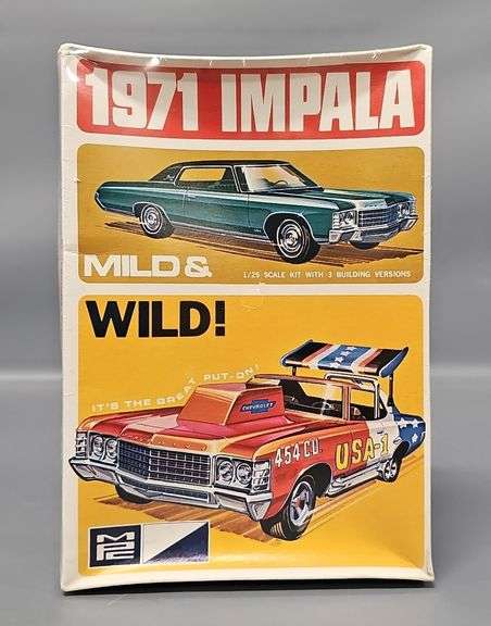 Factory Sealed MPC 1971 Impala Mild & Wild Series 1/25 Scale Model Kit, stock number 1-7102-225. Kit is still perfectly sealed but the lid is sunken in but still has great graphics.