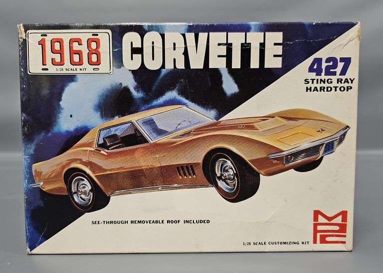 DescriptionMPC 1968 Corvette 427 Sting Ray Hardtop 1/25 Scale Model Kit, stock number 568-200. This kit may or may not be complete as almost all of the parts are loose from the sprues but no work has been started. Comes with a good original instruction sheet and mint unused decal sheet plus foil sheet in a very good original box.
