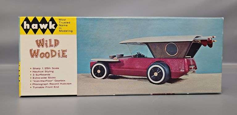Hawk Wild Woodie 1/25th Scale Model Kit, stock number 545-100. This kit appears to be complete with many parts still attached to the sprues. Comes with a crisp original instruction sheet in a high-grade original box.
