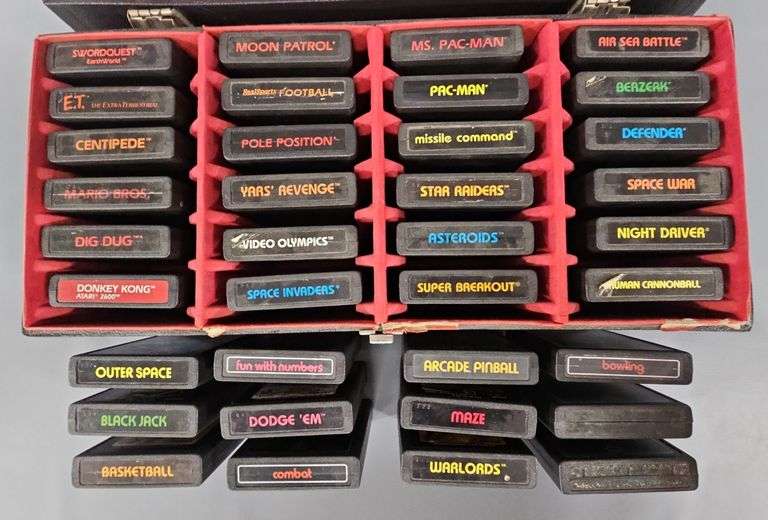 DescriptionGroup of 36 Vintage Atari 2600 Game Cartridges. Included are assorted Atari and Sears Tele-Games titles, including Outer Space, Breakout, Dodge 'Em, Fun with Numbers, Warlords, Black Jack, Sword Quest, Centipede, Dig Dug, ET The Extra Terrestrial, Mario Brothers, Donkey Kong, Real Sports Football, Moon Patrol, Pole Position, Yar's Revenge, Video Olympics, Space Invaders, and many more. These cartridges have not been tested and are in fair to excellent condition