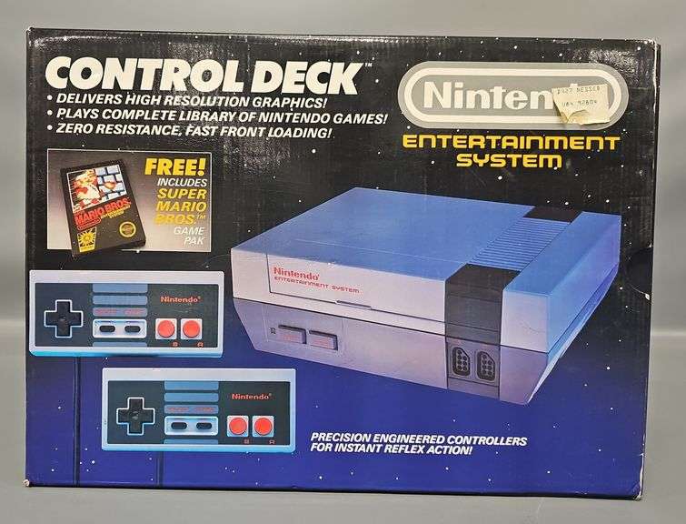 Nintendo NES Control Deck System with Super Mario Bros game cartridge included. Comes with box, cables, controllers, and manuals, all in excellent condition but it has not been recently tested. It was working before it was last stored.