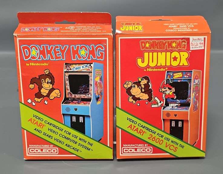 DescriptionColeco Donkey Kong & Donkey Kong Junior for Atari 2600, complete in original boxes. The boxes are in great shape for having been opened but there are some vein creases that are hard to see. The cartridges and original paperwork are in excellent or better condition.