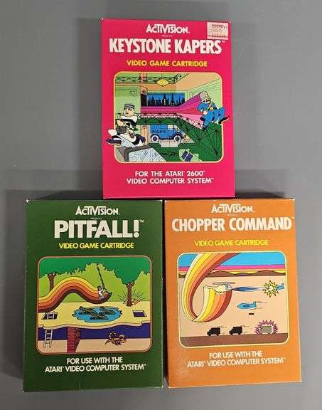 DescriptionActivision Atari 2600 Game Cartridges to include Keystone Kapers AX-025, Pitfall AX-018, Chopper Command AX-015. All three are complete in original boxes with all original paperwork. The boxes and paperwork are in excellent condition with Kay Bee price stickers.