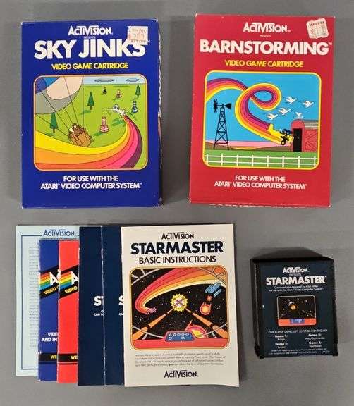 DescriptionActivision Atari 2600 Video Game Cartridges to include Barnstorming AX-013 and Sky Jinks AG-019 Video Game Cartridges complete in original boxes with original paperwork. Also includes Starmaster AX-106 with all of its original paperwork.
